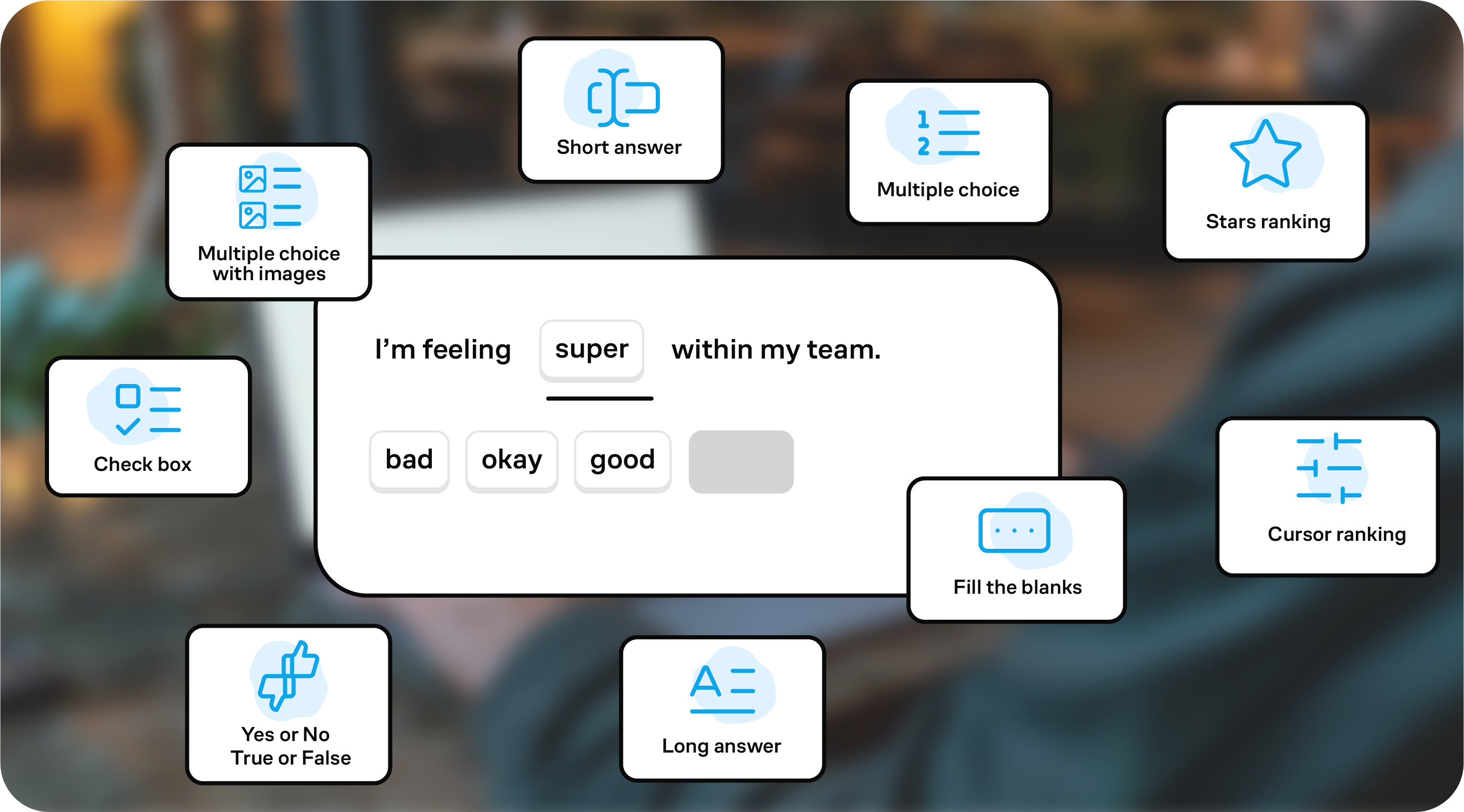 Choose from text input, multiple choice, rating scales, yes/no questions, image selection, and more.